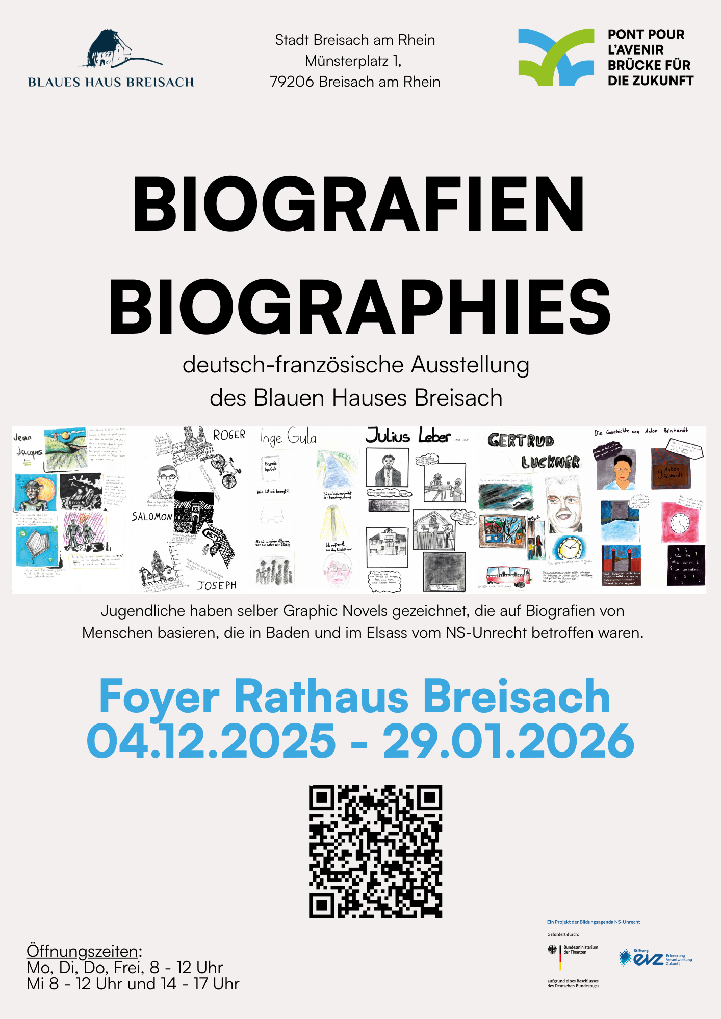 Im Rahmen des Biografie-Projekts von „Brücke für die Zukunft – Pont pour l’avenir“ ist eine Wanderausstellung entstanden, die nun auch im Rathaus Breisach zu sehen ist. Interessierte und Schülergruppen sind herzlich zur Besichtigung eingeladen. Lehrkräfte erhalten beim Team des Blauen Hauses auf Anfrage ein Quiz zur Ausstellung.