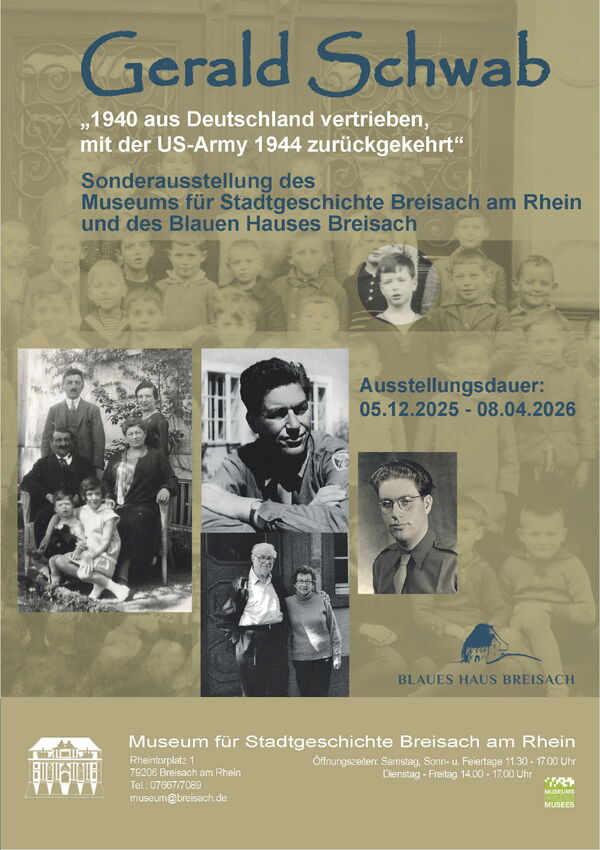 Unsere Mitglieds-Gedenkstätte, das „Blaue Haus“ in Breisach, lädt zur gemeinsamen Ausstellung des Museums für Stadtgeschichte Breisach und des Blauen Hauses ein. Diese widmet sich Gerald Schwab, der vor 100 Jahren als Gerhard Abraham Schwab in Freiburg geboren wurde. Seine familiären Wurzeln führen nach Breisach, wo seine Mutter Paula Kleefeld und sein Vater David Schwab geboren wurden und aufgewachsen sind. Der Familie gelang die Flucht in die USA. Von dort kehrte Gerald Schwab 1945 zurück nach Deutschland, um mit der US-Army für die Befreiung Europas von den Nationalsozialisten zu kämpfen. Als nur 20Jähriger wurde er Übersetzer bei den Nürnberger Prozessen bevor er ein Universitätsstudium antrat und später im diplomatischen Dienst der USA stand.
