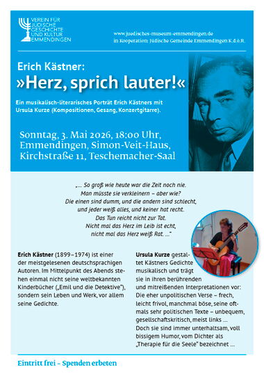 Erich Kästner (1899–1974) ist einer der meistgelesenen deutschsprachigen Autoren. Im Mittelpunkt des Abends stehen einmal nicht seine weltbekannten Kinderbücher („Emil und die Detektive“), sondern sein Leben und Werk, vor allem seine Gedichte.