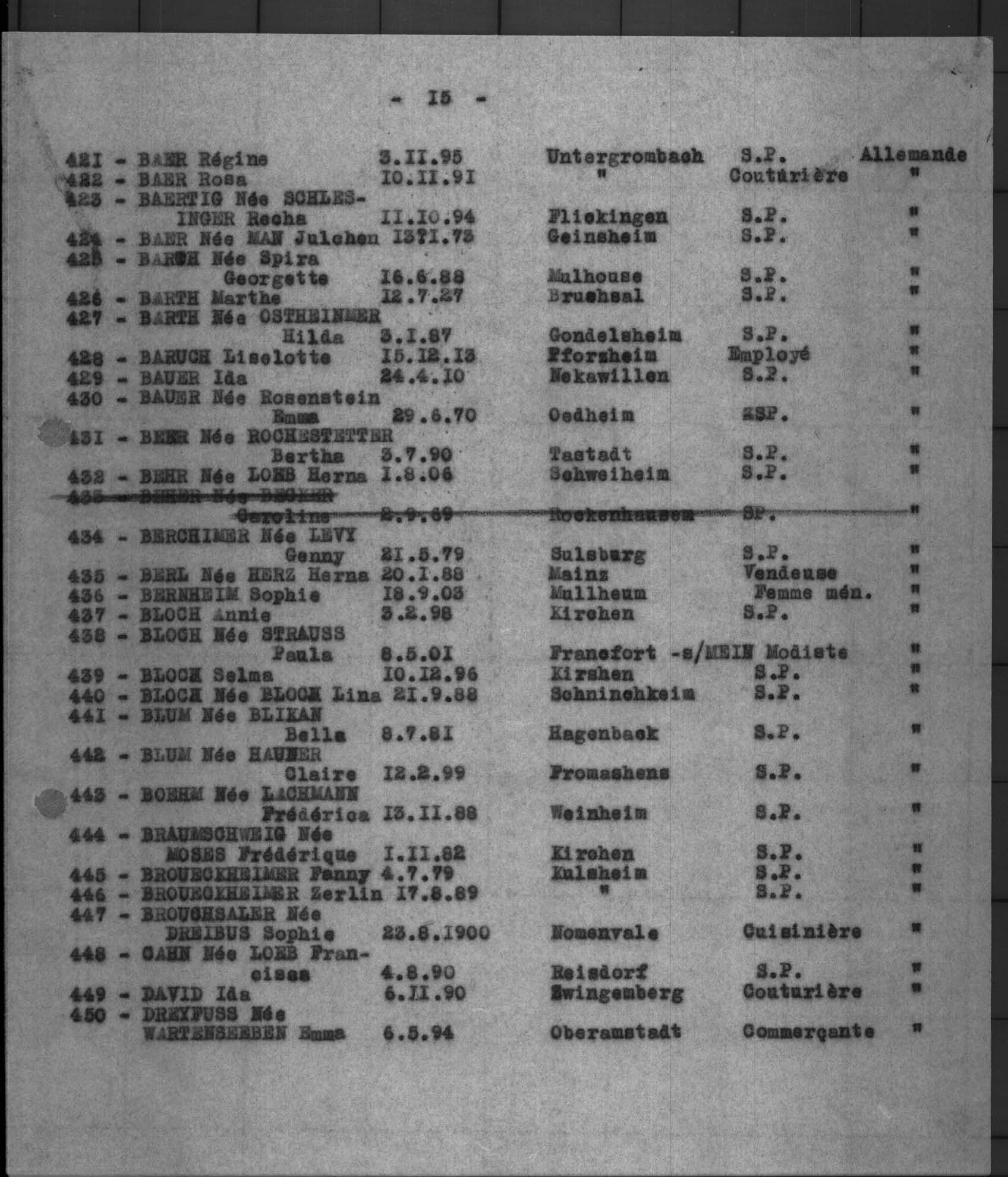 Sophie Bernheim wurde am 18. September 1903 in Müllheim geboren. Sie war Hausgehilfin und lebte in Emmendingen. Vom 19. Oktober 1936 bis zum 25. Februar 1937 wohnte sie in der Theodor-Ludwig-Str. 8. Sie kehrte nach Müllheim zurück und lebte anschließend ab dem 6. März 1937 bis zum 15. Juli 1937 wieder in der Theodor-Ludwig-Str. 8 bei Jakob Wendel. Vom 15. Juli 1937 bis 15. April 1939 wohnte sie in der Karl-Friedrich-Str. 17 (bei Metzgermeister Leopold Goldschmidt). Als Sofie Bernheim in Emmendingen keine Arbeit mehr als Hausgehilfin fand, ging sie ins jüdische Friedrichsheim nach Gailingen. Bei dieser Einrichtung handelte es sich um ein jüdisches Altersheim, auch "Landesasyl" genannt. Dort lebte sie ab dem 15. April 1939. Am 22. Oktober 1940 wurde sie aus Konstanz nach Gurs deportiert. Das Durchgangslager war Drancy, das Deportationsdatum der 10. August 1942, RSHA-Transport 17. Der 12. August 1942 ist das Todesdatum vom Sophie Bernheim, als der RSHA-Transport 17 in Auschwitz-Birkenau ankam.